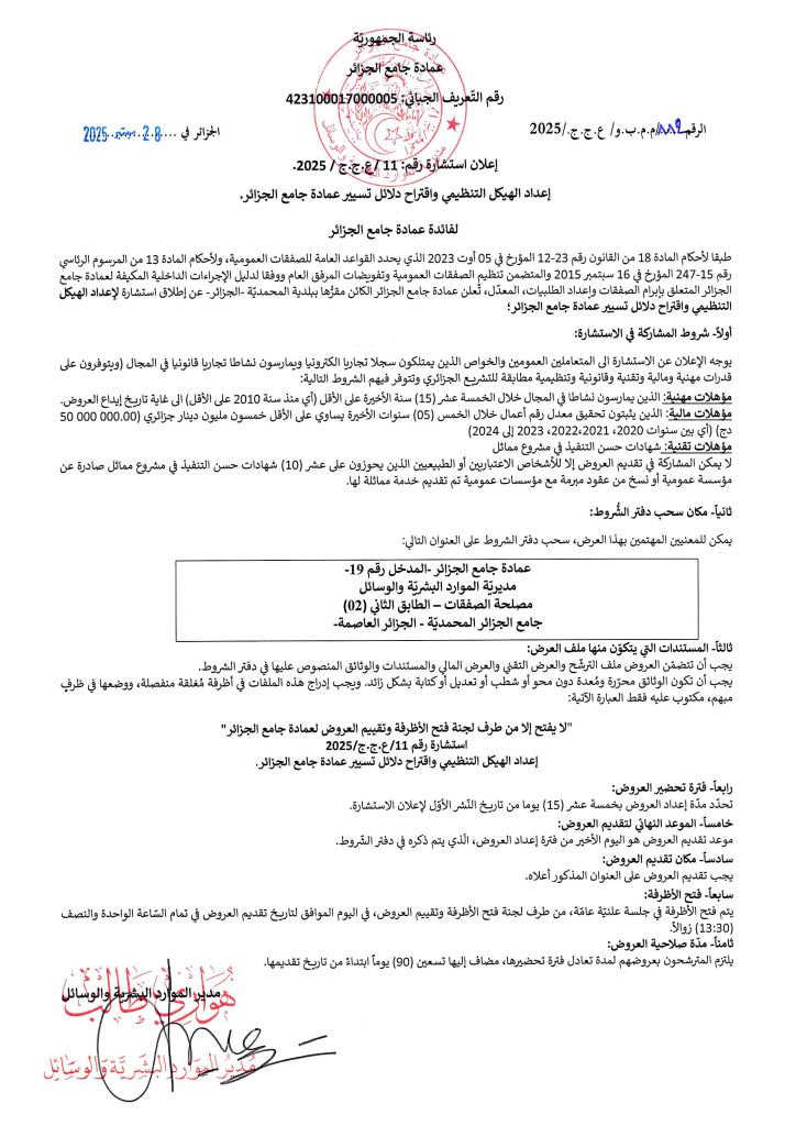 طبقا لأحكام المادة 18 من القانون رقم 23-12 المؤرخ في 05 أوت 2023 الذي يحدد القواعد العامة للصفقات العمومية، والأحكام المادة 13 من المرسوم الرئاسي رقم 15-247 المؤرخ في 16 سبتمبر 2015، والمتضمن تنظيم الصفقات العمومية وتفويضات المرفق العام، ووفقا لدليل الإجراءات الداخلية المكيفة لعمادة جامع الجزائر المتعلق بإبرام الصفقات وإعداد الطلبيات المعدل، تعلن عمادة جامع الجزائر الكائن مقرها ببلدية المحمدية – الجزائر – عن إطلاق استشارة لإعداد الهيكل التنظيمي واقتراح دلائل تسير عمادة جامع الجزائر.