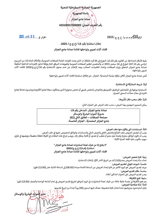 طبقا لأحكام المادة 18 من القانون رقم 23-12 المؤرخ في 05 أوت 2023، الذي يحدد القواعد العامة للصفقات العمومية، والأحكام المادة 13 من المرسوم الرئاسي رقم 15-247، المؤرخ في 16 سبتمبر 2015، والمتضمن تنظيم الصفقات العمومية وتفويضات المرفق العام، ووفقا لدليل الإجراءات الداخلية المكيفة لعمادة جامع الجزائر المتوافق لإبرام الصفقات واعداد الطلبيات، المعدل، وبعد الإعلان عن عدم جدوى الاستشارة رقم 10/ع.ج.ج/2025، تُعلن عمادة #جامع_الجزائر الكائن مقرها ببلدية المحمدية – الجزائر، عن إطلاق #استشارة لاقتناء آلات تصوير ولواحقها.