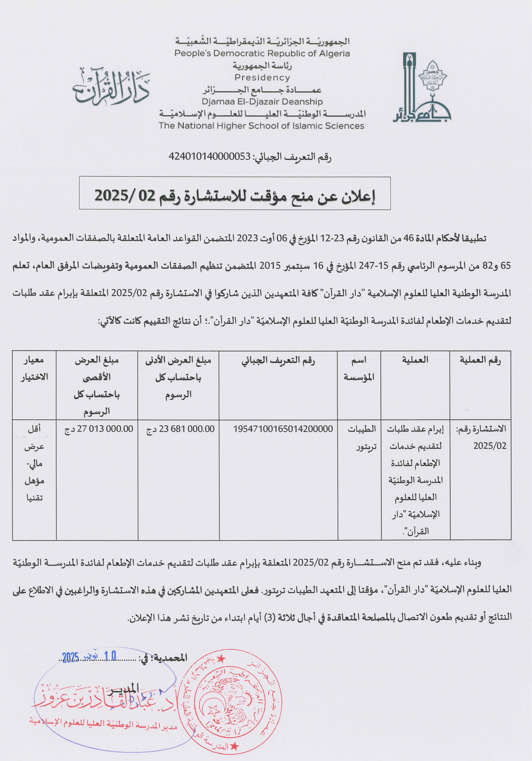 تُعلم المدرسة الوطنية العليا للعلوم الإسلاميّة “دار القرآن” كافة المتعهدين الذين شاركوا في الاستشارة رقم:02/2025، المتعلقة بإبرام عقد طلبات لتقديم خدمات الإطعام لفائدة المدرسة الوطنية العليا للعلوم الإسلاميّة “دار القرآن”، أن نتائج التقييم كانت كالآتي: