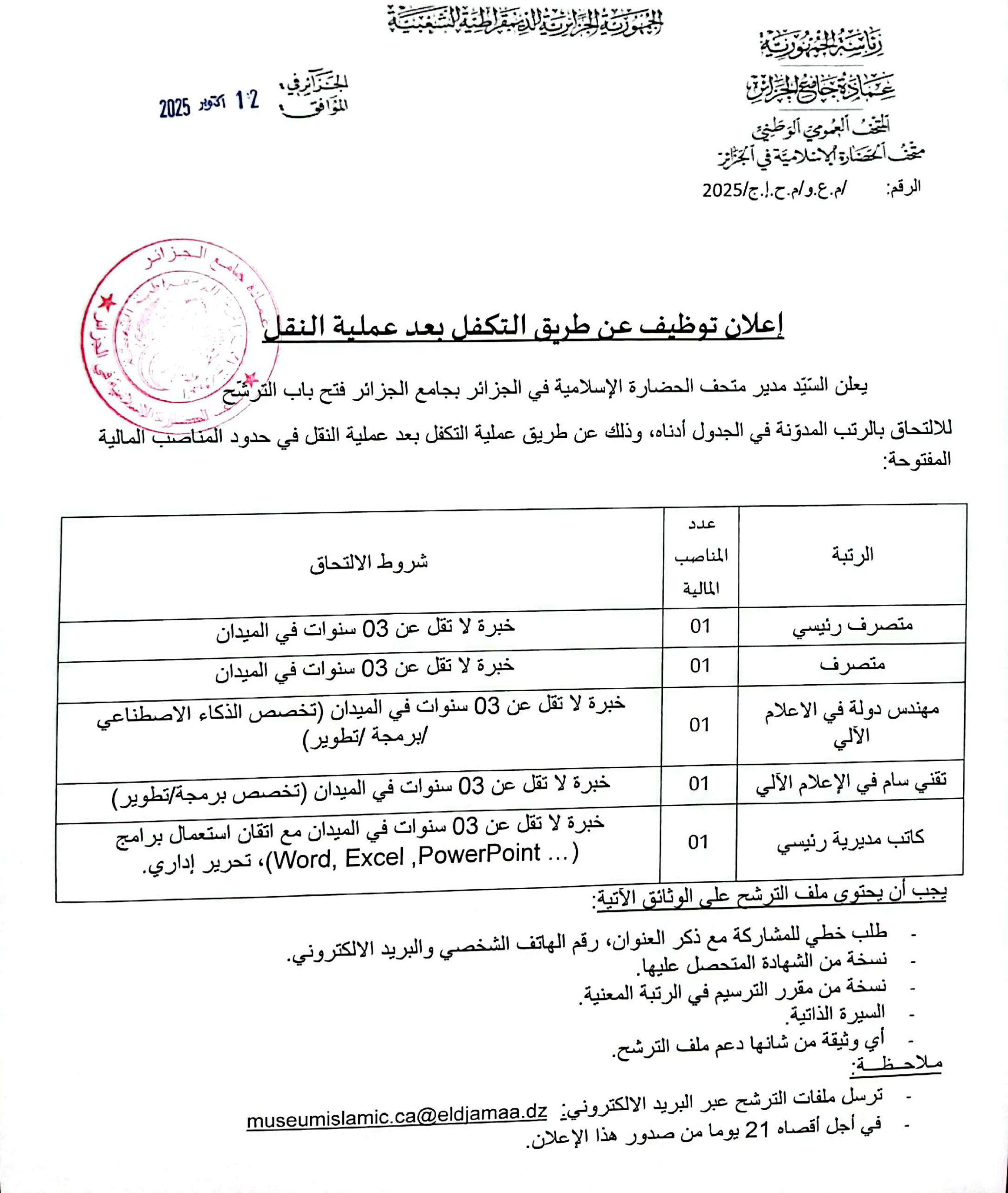 يعلن السّيّد مدير متحف الحضارة الإسلاميّة في الجزائر بجامع الجزائر فتح باب الترشح للالتحاق بالرتب المدوّنة في الجدول أدناه