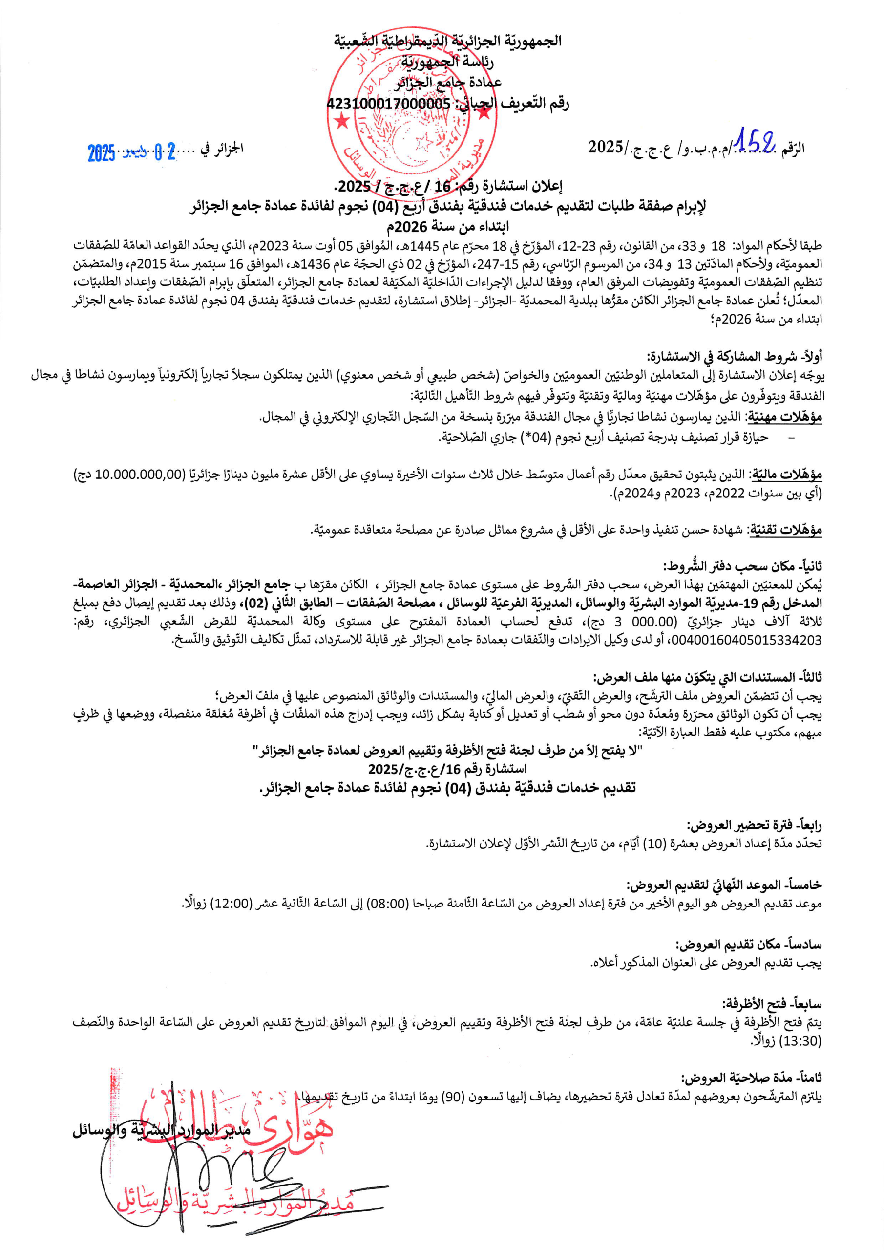 إعلان استشارة رقم: 16/ع.ج.ج/2025، لإبرام صفقة طلبات لتقديم خدمات فندقيّة بفندق أربع (04) نجوم لفائدة عمادة جامع الجزائر ابتداء من سنة 2026.
